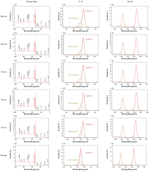 Many XPS measurements are shown in descending order of thickness, concluded by the powder samples. Each column is designated as one for either a survey scan, O 1s electrons, or Sn 3d electrons.