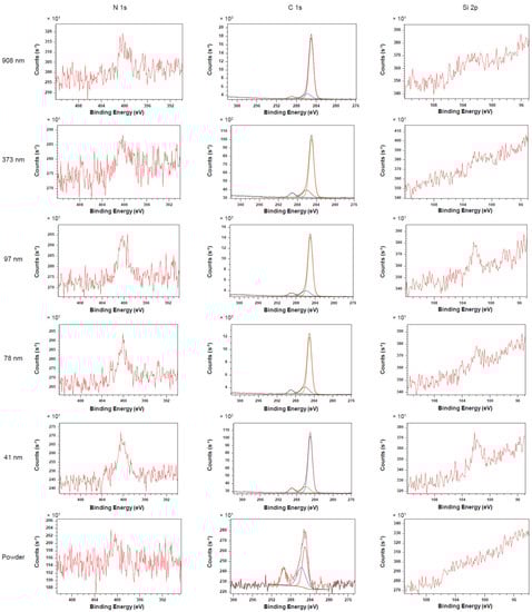 Additional observations can be noted from the data shown in Figure 8, starting with the nitrogen 1s electrons. The difference seen is mainly between film and powder, where the response from the powder is 4 to 5 times lower than its film counterpart. Lastly, the silicon 2p electrons exhibit the smallest of all the responses, with none recorded from the powder, and very weak signals recorded from the films. No strong measurable trend can be extracted from the data collected on the samples. All experimental parameters are described in the Methods section.