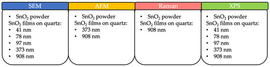 Powders and films composed of tin dioxide (SnO2) are promising candidates for a variety of high-impact applications, and despite the material’s prevalence in such studies, it remains of high importance that commercially available materials meet the quality demands of the industries that these materials would most benefit. Imaging techniques, such as scanning electron microscopy (SEM), atomic force microscopy (AFM), were used in conjunction with Raman spectroscopy and X-ray photoelectron spectroscopy (XPS) to assess the quality of a variety of samples, such as powder and thin film on quartz with thicknesses of 41 nm, 78 nm, 97 nm, 373 nm, and 908 nm. In this study, the dependencies of the corresponding Raman, XPS, and SEM analysis results on properties of the samples, like the thickness and form (powder versus film) are determined. The outcomes achieved can be regarded as a guide for performing quality checks of such products, and as reference to evaluate commercially available samples.