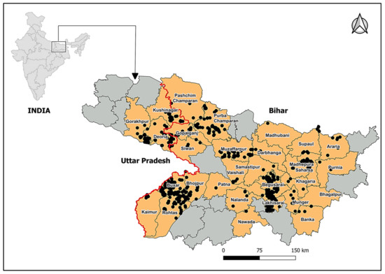 Map indicating locations of the trial. Black dots represent trial sites and red line denotes the boundary between Bihar and UP states.
