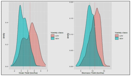 Overall, the comparison of grain yields revealed that the yields of the LDVs were higher than the SDVs. The yield difference between them was around 1 ton ha−1. The mean grain yield of LDVs in the top 10% cases was 5.95 ton ha−1, whereas this value for the SDVs was 4.45 ton ha−1. A similar comparison for the biomass yield of LDVs and SDVs highlighted a difference of slightly more than 2 ton ha−1 in favor of the LDVs. In the top 10% cases of LDVs and SDVs, the mean biomass yields were 14.16 and 10.81 ton ha−1, respectively. These numbers very clearly indicate that LDVs have substantially higher potential (Figure 2).