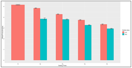 There was a continuous decline in grain yield as the sowing time progressed, starting from 1 November for both varietal classes. In the first two treatments (T1 and T2), the mean grain yields of the LDVs were close to 5 ton ha−1—slightly more in T1 than T2. Yield losses were expected for the SDVs (N = 53) in T2, so pairwise varietal comparisons were limited to T3, T4, and T5. Contrary to farmers’ general perception of SDVs being suitable in late-sown scenarios, the LDVs outperformed the SDVs for all sowing date windows. In T3 and T4, the grain yields of the LDVs were approximately 0.5 ton ha−1 higher, whereas in T5 they were 0.4 ton ha−1 higher compared to the SDVs (Figure 3).