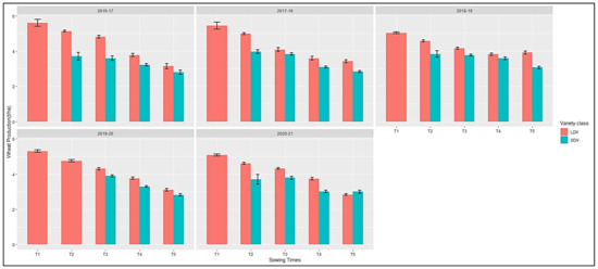 The research was conducted at the landscape level for five consecutive wheat seasons starting from 2016–2017 to 2020–2021 on farmers’ fields. The objective of this study was to quantify yield loss trends along the typical sowing date gradient and evaluate if the rate of decline was constant for the whole wheat sowing window. Another purpose of this work was to generate evidence on the comparative performance of long-duration wheat varieties (LDVs) and short-duration wheat varieties (SDVs) for different planting dates—do SDVs really outperform under late-sown conditions? Farmers are generally inclined towards SDVs in late-sown scenarios. The trial had five treatments of sowing time—(T1) 1 to 10 November, (T2) 11–20 November, (T3) 21 to 30 November, (T4) 1–15 December, and (T5) 16–31 December. T3, T4, and T5 had two sub-plots each of LDVs and SDVs. T1 and T2 had only LDVs because SDVs are generally planted after 20 November in field situations.