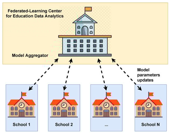 In Figure 1, we illustrate the proposed cross-silo scheme for the educational system. The goal is to use the federated learning paradigm to enable a centralized analysis of education system data while avoiding the corresponding centralization of raw data. The proposed approach would allow higher government institutions in charge of the education system to conduct data analytics using ML models while preserving the teachers’ and students’ privacy. A similar scenario has been extensively studied in the context of healthcare applications [,,]. scheme. The main difference is that the proposed education cross-silo scheme uses horizontal rather than vertical partitioning. In our case, the different educational institutions share the same data schema, with all of them sharing the same attributes for students and courses.