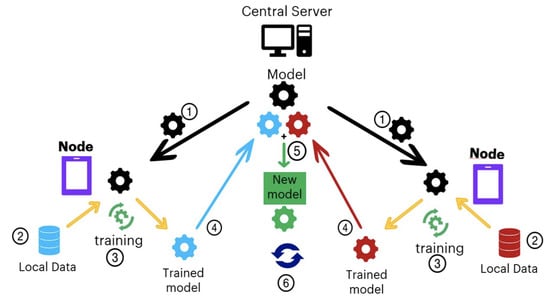 For computing the model’s parameters, an iterative process between model parameter estimation within the clients and actualization of the parameters in the server is carried out. In each iteration, specific clients are chosen to train the model with its own data locally. Then, the server aggregates all clients’ results to update the model’s state, which will be deployed on new clients in the next iteration, repeating the process [].