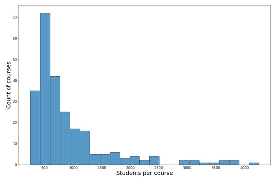 Histogram showing the count of courses with a certain number of students. About 70 courses have about 500 students.