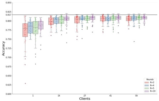 The centralized version achieves a mean accuracy of across the 50 different splits and a mean running time of s. This case is our baseline. Figure 4 shows the results in terms of accuracy for the federated case, where each point represents the result of one of the 50 executions. Increasing the number of clients from 1 to 14 causes a leap of 2–3% in the mean accuracy. At the same time, additional increments in the number of clients only cause a marginal increase in the mean accuracy but also produce a rise in the execution time (see Figure A1 in Appendix A). If the number of clients is fixed, we can see that favoring the number of rounds R over local epochs E tends to yield a better accuracy overall (boxes in each group go up), but again, this will cause an increment in time. It is also worth noting that variance decreases as we increase the clients and the rounds.