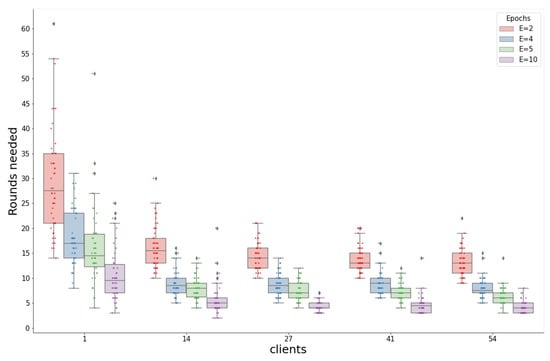 Figure 5 shows our results; we can see that it is possible to reach the accuracy of the centralized model in every case, with the caveat that many rounds may be needed. The maximum number of rounds is needed when training with one client per round, and the resulting accuracy presents a significant variance. From 14 clients onward, the results do not vary significantly; that is to say, increasing the number of clients does not necessarily improve convergence. Increasing E lowers the average R necessary to reach our baseline accuracy (81.7%) in every case. However, there is no 1:1 inverse relationship; for instance, if E = 2, an average of 16 rounds is needed, but if E = 10, we need six rounds. Thus an ×5 increase ratio in E but only an ×2.6 decrease ratio on R.