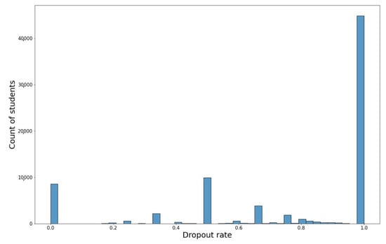 In the second scenario, the clients are generated by sampling from subsets of the original data, which are partitioned into three parts, using criteria based on the dropout rate. Given a student S, we define their dropout rate as the ratio of courses where they dropped out, out of all the courses in which they are enrolled. Figure 6 shows the distribution of this number across all students. We can see that most students have a dropout rate of 1; they dropped out of all their courses. Others have a dropout rate based around 0.5, so they dropped out from about half of their courses, and the rest have dropped out from no courses, so their dropout rate is 0. Based on this insight, we define three intervals: students with dropout rates from 0 to 0.2, from 0.2 to 0.8, and from 0.8 to 1. The size of the categories is shown in Table 2. Therefore, now with the defined categories, on the first phase of the execution of the experiment, we again sample 1000 students to define each client, generating its pairs as explained before, but with the condition that all students must be part of the same category of dropout rate. Based on Table 2, this process yields 9 clients with students having a low dropout rate (8 in 1000 students, 1 in 723), therefore having a label distribution skewed towards the negative class (e.g., cases of no dropout); 21 clients with a medium dropout rate, so a neutral label distribution; and 7 clients with a high dropout rate and therefore with a label distribution skewed towards the positive class. This heterogeneous scenario tries to emulate the case in real life where different institutions may have different levels of overall engagement (e.g., different overall dropout rates), either because of their teaching methods, the socio-economic background of their students, or any other reason. With our experiments, we hope to see how this affects each scheme’s performance and what scheme works better for each kind of institution.