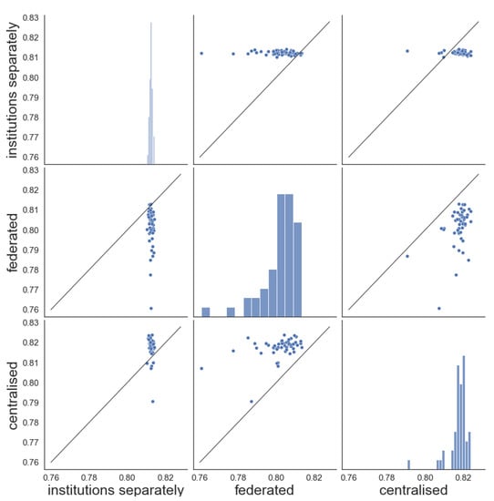 Mean accuracy comparison of 50 independent runs using three training schemes: institutions alone, federated, and centralized. Homogeneous scenario (clients made sampling randomly from the data set). Figure is symmetrical.