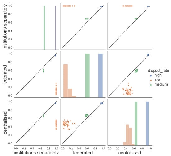 Since fewer students have a low dropout rate (11.54% of the whole population), they are underrepresented in the total dataset, so they perform the worst in the centralized scheme (quadrant at bottom-right). Furthermore, this category only features nine institutions out of the 77 available; therefore, they are sampled less frequently during the federated averaging algorithm in the federated scheme and tend to perform poorly, seeing that they also have the worst performance for this scheme (middle quadrant). However, when the training is carried out separately, the models fit nicely to each institution’s data, regardless of their low proportion on the whole federation. The models never see the data on the rest of the institutions since they train and test in isolation. In this case, we achieve better performance (top-left, where orange and blue bins are overlapped) than in centralized and federated schemes (see orange dots on bottom-left and middle-left).