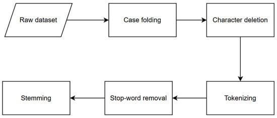 This study employed a variety of experimental methods to discover the ideal preprocessing technique. The preprocessing steps used in this inquiry are shown in Figure 2. Trials in this study employed stemming and two distinct sets of stop-words. The stop-word removal technique keywords were extracted from a repository at the following address: https://github.com/datascienceid/stopwords-bahasa-indonesia (accessed on 18 February 2021). This study aimed to discover which of the two lists of stop-words would be more beneficial in this work. The first set of stop-words was taken directly from the aforementioned source. The second list, on the other hand, contained modified variants of already established stop-words. Numerous new stop words have been introduced, while negation terms have been eliminated. Eliminating negation words and introducing new stop words were among the modifications. Four distinct tests were undertaken in this work.