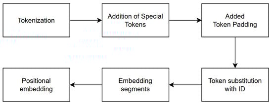There are two steps to the BERT procedure: pre-training and tuning. During pre-training, which is conducted on a massive corpus of unlabeled text, the model will perform several tasks, including masked language modeling and sentence prediction. The fundamental objective of this basic training step is to develop a model capable of recognizing the context of a language. After receiving preliminary instruction, the model may be customized for specific occupations. Models are fine-tuned by executing them on training parameters and then adjusting them using labeled data [72]. The input representation is utilized to represent the input as a phrase on the token sequence, enabling it to perform a number of tasks. Each of these tokens will be represented with three distinct embeddings. There are three types of embedding: token embedding, segment embedding, and positional embedding. They provide the input representation for BERT. The model uses these three symbols in a variety of ways [73].