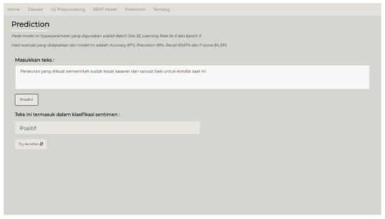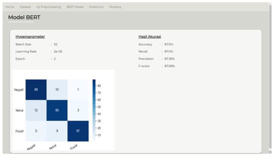 The web-based application that contains the sentiment analysis system was developed using the flask web framework in Python. Users can input hyperparameter values that will be used for training BERT models provided by the program. In addition to the confusion matrix and numbers for accuracy, precision, recall, and f-score displayed in Figure 4, the viewer may examine the BERT model assessment results. In addition, Figure 5 displays the interface for user prediction. Users can submit a sentiment statement and the program will predict its label and display the results to the user. The application uses the Indonesian language to make it easier for Indonesian people to use it.