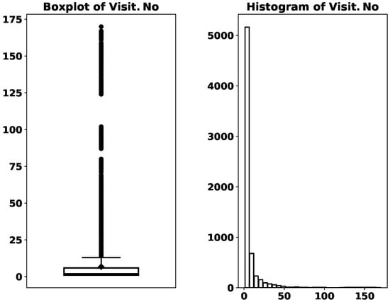 Visit.No’s distribution. It is highly skewed to the right. While the majority of the records have their