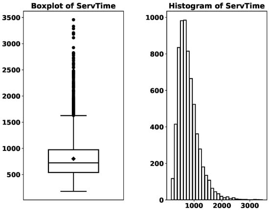 First, we identified 20 records with a derived service time longer than one hour ( seconds). Most of them are the last consultation in the half-day sessions. The clinic’s manager explains that the last patient will occasionally make the payment later because the front desk leaves for lunch. Therefore, without a follow-up patient’s starting time, a possibly delayed payment leads to a very large ServTime. In addition, 167 ServTime’s are less than three minutes. These short consultations may result from occasional abnormalities, such as the physician accidentally clicking a wrong patient’s record or getting interrupted by another patient. We dealt with the abnormalities following the advice of the clinic’s manager, i.e., service times larger than 60 min or less than 3 min were considered outliers. There are 187 records identified. Filtering out such outliers and the 28 missing values in ServTime, the remaining data have 6638 records left.