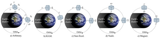 Attitude refers to the pointing direction of the spin axis in satellites [17]. Even if the sun shines on the spacecraft, the absorption of solar radiation is a function of the attitude. Therefore, nanosatellites on identical orbits may have surfaces under different scenarios of solar flux as a consequence of their attitudes, e.g., some arbitrary spin, RAM (the spin axis is aligned with the velocity vector), sun-fixed (one or more sides constantly towards the sun), nadir (one or more sides constantly towards the center of the earth) or magnet (here referring to the state obtained by passive attitude control where the nanosatellite follows the earth’s magnetic field). Figure 1 illustrates these attitudes.