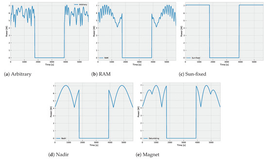 Five different results for power generation are illustrated in Figure 2. Except for the attitude, they have the following common parameters: , , , , , and rev/day (equivalent to the altitude of 500 km), valid for 21 March 2023.