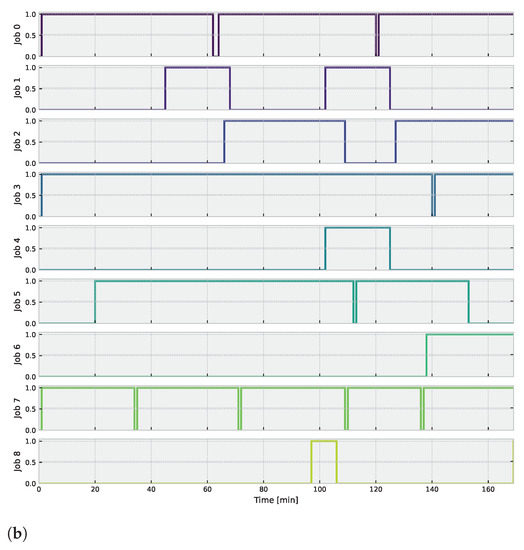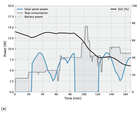 (a) Power (W) and SoC (%) usage along the orbit; (b) schedule for each job.