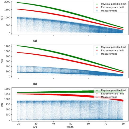 - Forstinger, A.; Wilbert, S.; Kraas, B.; Peruchena, C.F.; Gueymard, C.A.; Collino, E.; Ruiz-Arias, J.A.; Martinez, J.P.; Saint-Drenan, Y.-M.; Ronzio, D.; et al. Expert Quality Control of Solar Radiation Ground Data Sets. In Proceedings of the ISES Solar World Congress, New Delhi, India, 25–29 October 2021. [Google Scholar]