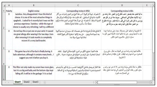 - E_MSA_BDs-PR-SA.csv: is composed of four columns. The first one is polarity, which is represented by 0 and 1. The second column is the “English review”, the third column is the “corresponding review in MSA”, and the fourth one is the “corresponding review in BDs”, as shown in Figure 1;