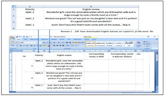 - The selected 5000 reviews were copied into 25 separate Ms-word files. The copied reviews have been validated manually by correcting the spelling and grammar errors, using a Ms-word grammar and spelling checker supported by a human checker specializing in English–Arabic–English translation, and by deleting the sentences that are not affecting the review sentiment. This deletion was aimed to provide reviews with a reasonable length, not exceeding 200 words, which aid the capturing of meaning by participants for a manual translation of MSA reviews to BDs. Each of the 25 files includes a template for a table composed of six columns: number, label, review in English, corresponding review in MSA, corresponding review in BDs, and a city, as shown in Figure 2. The Ms-word files have been saved as P1, P2, and P3…P25. Each Pi contains 200 balanced reviews. This numbering method helps in identifying each review in the stage of distributing the MSA reviews and collecting their corresponding ones in BDs, as will be explained later;