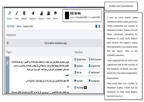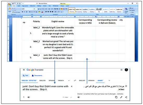 Figure 3. Example of translating an English review to MSA. - The 5000 MSA reviews that resulted from the translation process were distributed to Bahraini dialect native speakers using 500 customized forms that were constructed through https://getfoureyes.com/ (accessed on 5 December 2019). Each form includes 10 different and unique MSA reviews. Below each review, a text box was provided where the respondent can rewrite the review in their spoken dialect, as depicted in Figure 4.