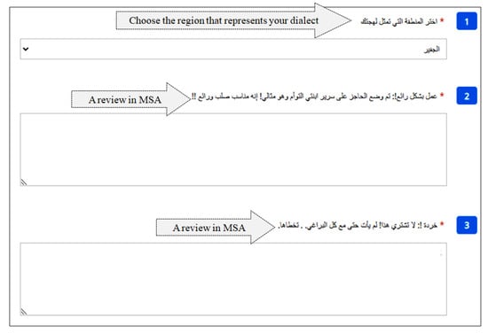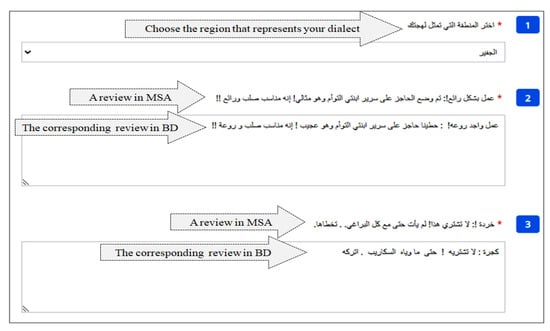 At the beginning of the form, an instruction was provided for the respondents requesting them to rewrite the provided MSA reviews in their dialects, sentence by sentence, and rewrite the word as it is, if there is no synonym for it in BDs.
