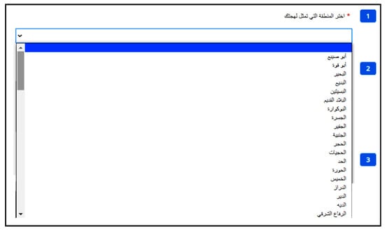 In addition, there is a combo box containing a list of Bahraini towns and villages, from which the respondent selects one of them that represents their dialect, as shown in Figure 5.