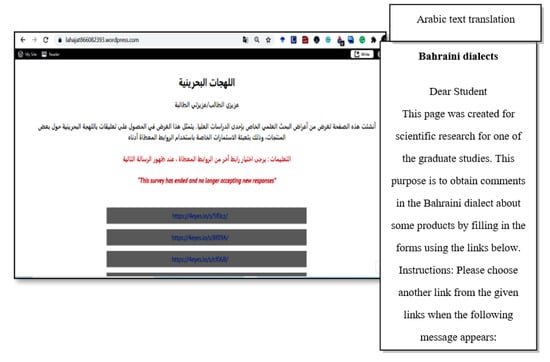 Each form was automatically assigned a link during its setup by https://getfoureyes.com/ (accessed on 5 December 2019). Some forms’ links were listed on a created web page: https://lahajat866082393.wordpress.com/ (accessed on 20 April 2021). The URL of the created web page was distributed to the respondents via WhatsApp application and text message. When the respondent visits the URL page, they will find the list of links as shown in Figure 7, where they were asked to choose a link. If a message such as “This survey has ended and no longer accepting new responses” is popped out, they should choose another form link. Such a procedure was followed to guarantee that all forms had been responded to and there were no duplicate responses.
