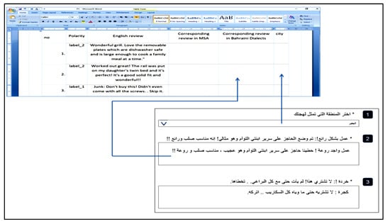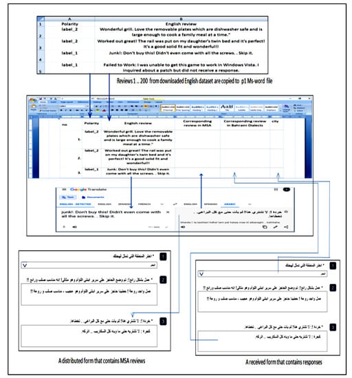 Here in this paper, a different approach was utilized to create our dataset of Bahraini dialects. This approach is translation, which can be employed in the case of resource scarcity []. The dataset presented here is a dataset that covers Amazon product reviews and is a balanced raw one, composed of 2500 positive and 2500 negative reviews. It was created by two cascading translation stages: machine and manual translation. Machine translation was applied to translate 5000 English Amazon product reviews to modern standard Arabic (MSA). In contrast, manual translation was employed to convert the resulting MSA reviews to Bahraini dialects by qualified native speakers utilizing constructed customized forms distributed electronically.