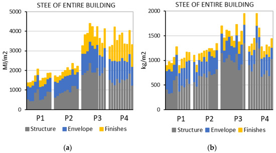 The Envelope’s STEE was increased by 1.53 times, while its STW value was reduced by 21%. Lastly, Finishes was the component that had the greatest increase in terms of STEE, with an increase of 3.96 times, and its weight increased by 1.22 times. Consequently, the entire building had an increase in its STEE value of 2.19 times and in its STW value of 1.36 times.