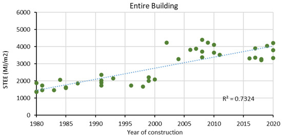 First, the variable of the Year of Construction is related to the value of the STW of the entire building. Figure 4 shows that these two variables have a positive correlation, although with a slight slope and with an R2 value of 0.4083. This indicates that the STW of the whole building does not depend as significantly on the Year of Construction as it does on STEE.