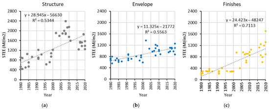 The change in construction systems in the last four decades has resulted in an increase in the STEE values of all components, and therefore of the entire building. The STEE and STW of the Structure component increased by 2.14 times and 1.92 times, respectively.