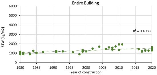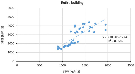 The last analyzed correlation is that between STEE and STW. In the entire building (Figure 6), the regression analysis shows a high positive correlation between STEE and STW with an R2 of 0.65. This shows that the total embodied energy demand of a building depends to a great extent on its weight.