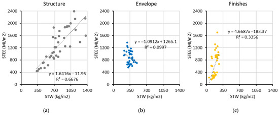 As in the previous sections, for a deeper analysis, these values (STEE and STW) have been correlated for each component. In the case of the Structure (Figure 7a), the R2 value is 0.67, which is the highest positive correlation of the three components. According to this analysis, the value of STEE can be calculated as a function of STW with Equation (3):