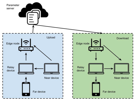 As shown on the right side of Figure 2, ENs distribute the global method to participants at the beginning of each global iteration, and each fading block of collaborative method download has two phases. NDs and RDs receive the global model from ENs in the first phase. RDs send the received model to FDs in the second phase. Privacy information could be leaked if RDs were able to decode the ENs’ superimposed code more quickly than FDs.