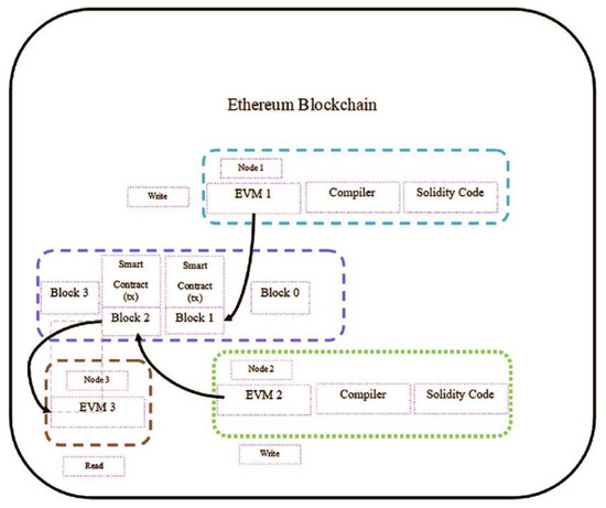 In order to simplify things, Figure 3 shows how Ethereum smart contracts work without the mining process. The EVM-1 transaction for this smart contract is broadcast to the blockchain after it has been machine-compiled into byte code, where each byte denotes a single operation. A miner intercepts it and confirms Block 1. EVM-2 retrieves web-based data after a user submits a request via a web interface, inserts it into a transaction, and then deploys it to the blockchain. In Block2, the status of transaction tx is modified. Node 3 must synchronize up to at least Block 2 in order to examine the future states contained in the contract and see the changes that tx results in.