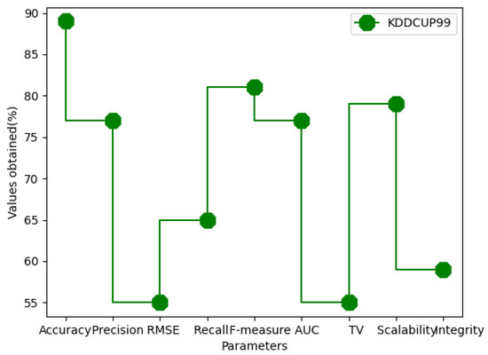 Figure 5 shows the parametric analysis for the KDDCUP99 dataset based on the proposed technique for cybersecurity datasets. Here, the proposed technique attained accuracy of 89%, precision of 77%, RMSE of 55%, recall of 65%, F-measure of 81%, AUC of 77%, trust value of 55%, scalability of 79%, and integrity of 59%.