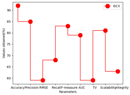 Figure 6 shows the parametric analysis for the ISCX dataset for the proposed technique. The proposed technique attained accuracy of 92%, precision of 85%, RMSE of 59%, recall of 68%, F-measure of 83%, AUC of 79%, trust value of 59%, scalability of 81%, and integrity of 63%.