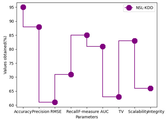 Figure 7 shows the parametric analysis for the NSL-KDD dataset based on the proposed technique for the cybersecurity dataset. Here, the proposed technique attained accuracy of 95%, precision of 88%, RMSE of 61%, recall of 71%, F-measure of 85%, AUC of 81%trust value of 63%, scalability of 83%, and integrity of 66%.