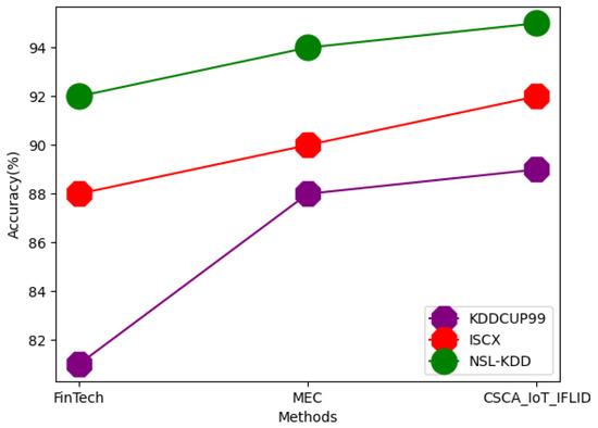 Figure 8 shows the analysis of accuracy. Here, the proposed technique attained accuracy of 89%, existing FinTech attained 81%, and MEC attained accuracy of 88% for the KDDCUP99 dataset; for ISCX, the proposed technique attained accuracy of 92%, existing FinTech attained 88%, and MEC attained accuracy of 90%; while the proposed technique attained accuracy of 95%, existing FinTech attained 92%, and MEC attained accuracy of 94% for the NSL-KDD dataset.