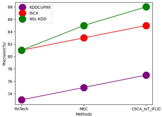 Figure 9 shows the comparison of KDDCUP99, ISCX, and NSL-KDD in terms of precision. For the KDDCUP99 dataset, the proposed technique attained precision of 77%, existing FinTech attained 73%, and MEC attained precision of 75%; for ISCX, the proposed technique attained precision of 85%, existing FinTech attained precision of 81%, and MEC attained precision of 83%;while the proposed technique attained precision of 88%, existing FinTech attained precision of 81%, and MEC attained precision of 85% for the NSL-KDD dataset.