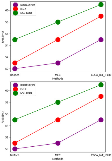 Figure 10 shows the comparative analysis of the RMSE. Here, the proposed technique attained RMSE of 55%, existing FinTech attained 50%, and MEC attained RMSE of 51% for KDDCUP99 dataset; for ISCX, the proposed technique attained RMSE of 59%, existing FinTech attained RMSE of 51%, and MEC attained RMSE of 55%;while the proposed technique attained RMSE of 61%, existing FinTech attained RMSE of 55%, and MEC attained RMSE of 58% for the NSL-KDD dataset.