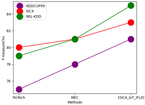 Figure 11 shows a comparison of F-measure for KDDCUP99, ISCX, and NSL-KDD. The proposed technique attained F-measure of 81%, existing FinTech attained F-measure of 75%, and MEC attained F-measure of 78% for KDDCUP99 dataset; for ISCX, the proposed technique attained F-measure of 83%, existing FinTech attained an F-measure of 80%, and MEC attained F-measure of 81%; while the proposed technique attained F-measure of 85%, existing FinTech attained F-measure of 79%, and MEC attained F-measure of 81% for NSL-KDD dataset.