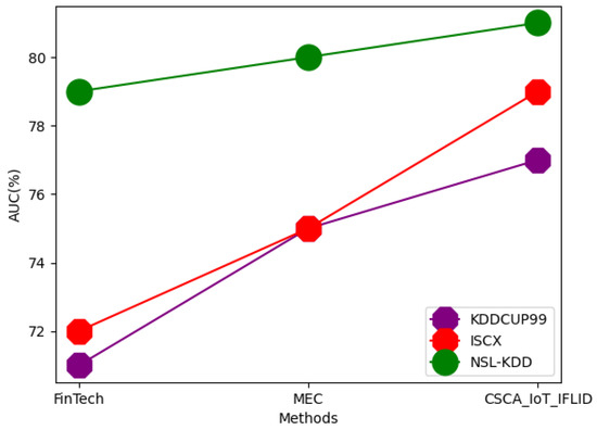 Figure 12 shows the comparative analysis of the AUC between the proposed and existing techniques. Here, the proposed technique attained AUC of 77%, existing FinTech attained AUC of 71%, and MEC attained AUC of 75% for KDDCUP99 dataset; for ISCX, the proposed technique attained an AUC of 79%, existing FinTech attained AUC of 72%, and MEC attained AUC of 75%;while the proposed technique attained AUC of 81%, existing FinTech attained AUC of 79%, and MEC attained AUC of 80% for NSL-KDD dataset.