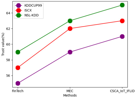 Figure 13 shows the comparative analysis of the trust value between the proposed and existing techniques. Here, the proposed technique attained a trust value of 61%, existing FinTech attained a trust value of 55%, and MEC attained a trust value of 59% for KDDCUP99 dataset; for ISCX, the proposed technique attained a trust value of 63%, existing FinTech attained a trust value of 57%, and MEC attained a trust value of 62%; while the proposed technique attained a trust value of 65%, existing FinTech attained a trust value of 59%, and MEC attained trust value of 63% for NSL-KDD dataset.