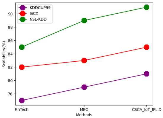 Figure 14 shows the comparative analysis of scalability between the proposed and existing techniques. Here, the proposed technique attained scalability of 81%, existing FinTech attained trust value scalability of 77%, and MEC attained scalability of 79% for KDDCUP99 dataset; for ISCX, the proposed technique attained scalability of 85%, existing FinTech attained scalability of 82%, and MEC attained scalability of 83%; and the proposed technique attained scalability of 91%, existing FinTech attained scalability of 85%, and MEC attained scalability of 89% for the NSL-KDD dataset.