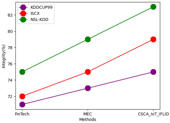 Figure 15 shows the comparative analysis of integrity between the proposed and existing techniques. Here, the proposed technique attained integrity of 75%, existing FinTech attained integrity of 71%, and MEC attained integrity of 73% for the KDDCUP99 dataset; for ISCX, the proposed technique attained integrity of 79%, existing FinTech attained integrity of 72%, and MEC attained integrity of 75%; while the proposed technique attained integrity of 83%, existing FinTech attained integrity of 75%, and MEC attained integrity of 79% for the NSL-KDD dataset.