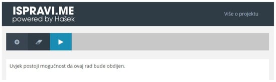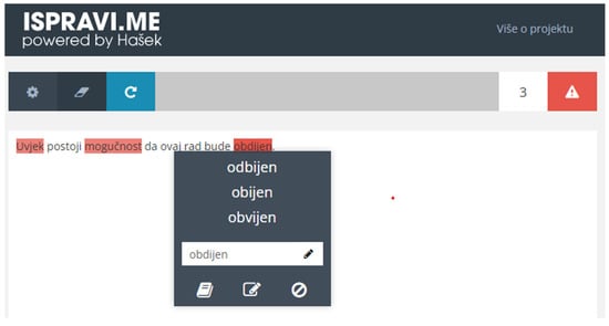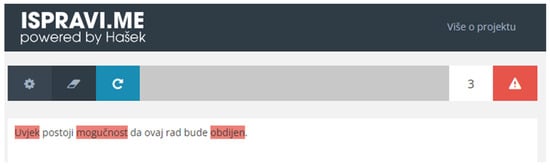 Ispravi.me (English Correct.me) [15] is a pioneering Croatian spellchecking service that was introduced in the early 1990s under the name of Hascheck (as an abbreviation of the Hrvatski akademski spelling checker—Croatian Academic Spelling Checker). Starting from a corpus of 100,000 Croatian words. It has since grown into a widely used online platform with more than 7000 daily user sessions as of March 2023. In fact, ispravi.me is currently the most popular spellchecking service for the Croatian language and is frequently used by major domestic news services. Because of the similarities among the South Slavic languages, it is also used in other countries bordering Croatia.